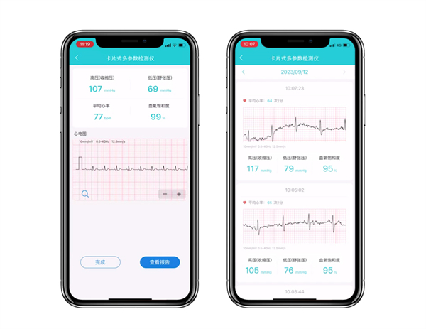 实时模式是通过蓝牙连接产品和超思健康APP,功能更加丰富,可以将离线数据上传手机端。测量过程中可以直观的看到心电波形等数据变化,手指移动或信号弱时有APP提示。测量结束自动生成检测结果报告,用户可以将检测结果一键分享给家人,让子女远程监护老人的健康状况。