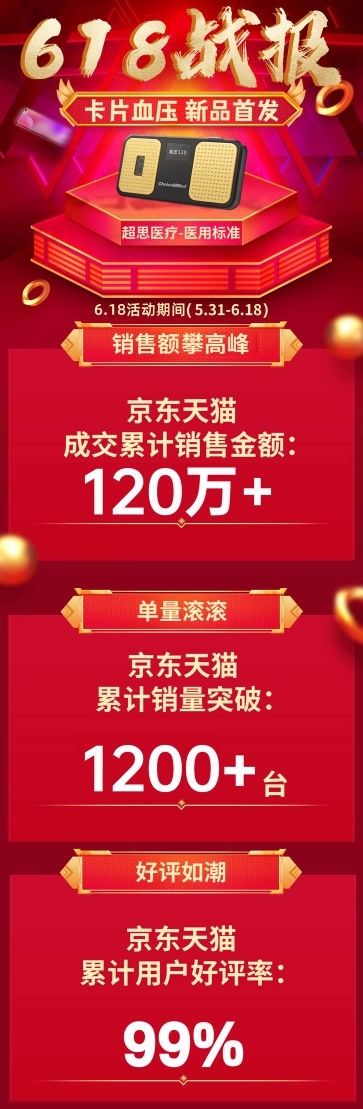 超思卡片血压计一经上线就迅速获得大量关注,从其京东自营及天猫旗舰店等电商平台数据来看,产品自上线以来的销量呈指数增长,销售额超出预期,目前好评率达到99%。