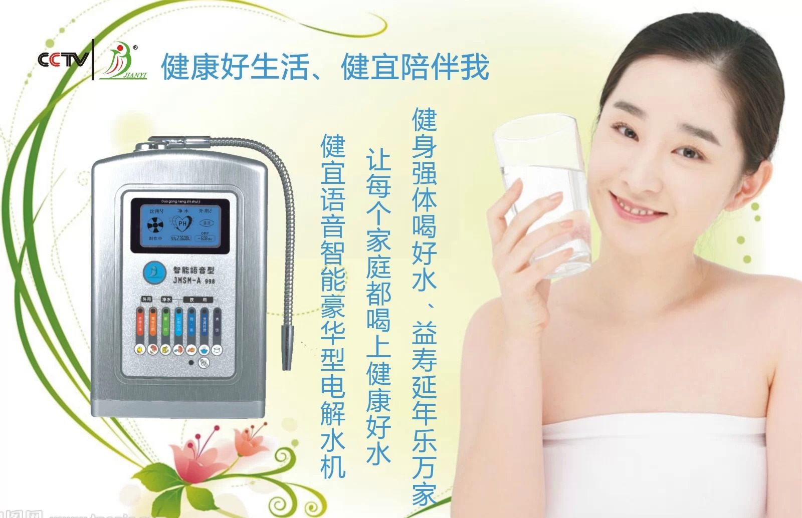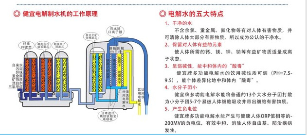 27.健益电解制水机的工作机理简介:自来水通过高品质的过滤系统(PP棉+椰壳颗粒活性炭+压缩式板状活性炭棒+原始纤维、中空纤维、碳纤维)的有效处理,去除中的余氯,有害菌类及铁锈、泥沙等杂质,在经过电气分解的方式生成可以直接生饮的碱性电解还原水和可以外用的酸性氧化电解水,并把13~15个单位大分子集团水分割成5~6个单位的小分子团水,增强了水的活性、水的渗透力及溶解力,同时提高了水的抗氧化还原能力。