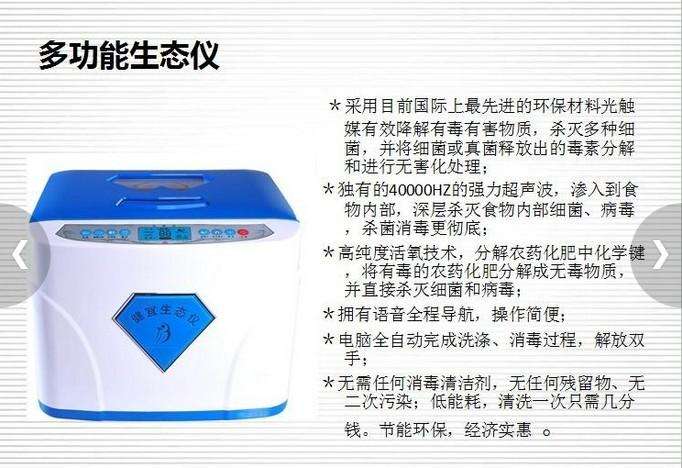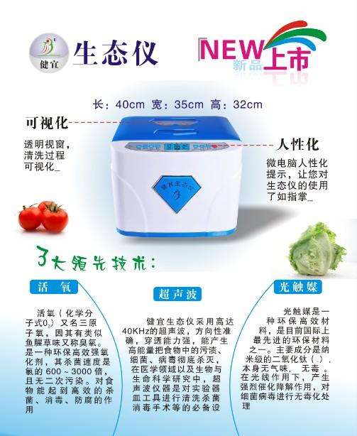 健宜生态仪,又叫多功能生态仪,是一款以还原我们生活生态系统食物为主打功能的多功能仪器,主要功能是利用光触媒、超声波、活氧、紫光灯做到了真正的安全环保产品,可以食物解毒,空气净化、果蔬清洗、餐具消毒、水源活化,食物解毒的作用尤为突出。