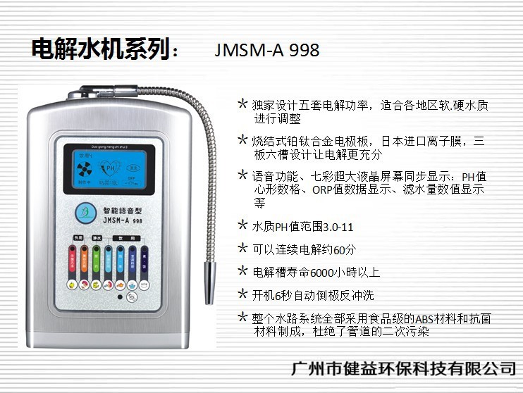 碱性离子水与其他用水,如矿泉水、纯净水等有很大的不同。(一)矿泉水含有一些矿物质,且未被氯或有毒有机物污染,为其优点。但矿泉水溶解力差或不具膨润作用。 (二)净水器滤过的纯净水其优点是氯减少,也变纯净了,但矿物质没有了,PH值大致维持中性,氧化还原水电位等皆与自来水相同。所以,使用健宜电解水机制造出来的水,即是好——碱性离子水”。