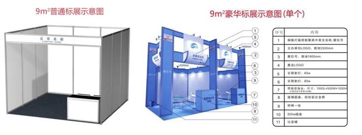 规格:3m×3m或3m×4m,含3面白色围板(高2.5米)、一张洽谈台、折椅二把、日光灯二盏、中英文楣板、垃圾篓、地毯、500W照明插座。豪华标展除以上配置外,对展位进行统一豪华装修,有效体现参展企业整体实力与形象。双开口的展位,另加收500元。