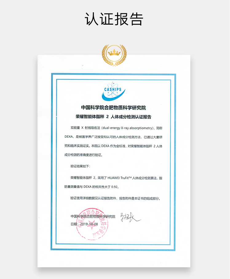 我们知道精准度是衡量体脂秤好坏的一项重要指标,在媒体和用户对荣耀智能体脂秤2的评价中,“最小分度0.1斤”、“测量准”是出现频率最高的描述。这得益于其采用的高精度抗干扰称重芯片,可以感知细微变化。并且,为了进一步提升测量的准确性,荣耀还与中国科学院合肥物质科学研究院联合开发了HUAWEI TruFitTM人体成分检测算法,并基于DEXA金标准进行了验证。作为一款家用级产品,荣耀智能体脂秤2与DEXA脂肪量测量值的相关性大于0.92,在精准度方面足以媲美健身房中20万元左右的专业体测设备。