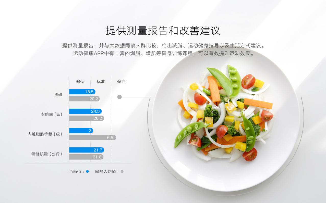 荣耀智能体脂秤2在APP端,通过华为运动健康不仅能清晰显示14项人体测量指标,生成整体测试报告,还会对测试结果进行分析,通过大数据对同龄人群进行比较,并输出减脂、运动健身指导、生活作息以及饮食方面的综合建议。