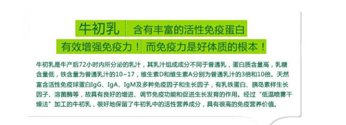 牛初乳是所有畜乳中化学组成很接近人乳的一种,增强免疫力。咨询电话:何经理18800238550(同微信)