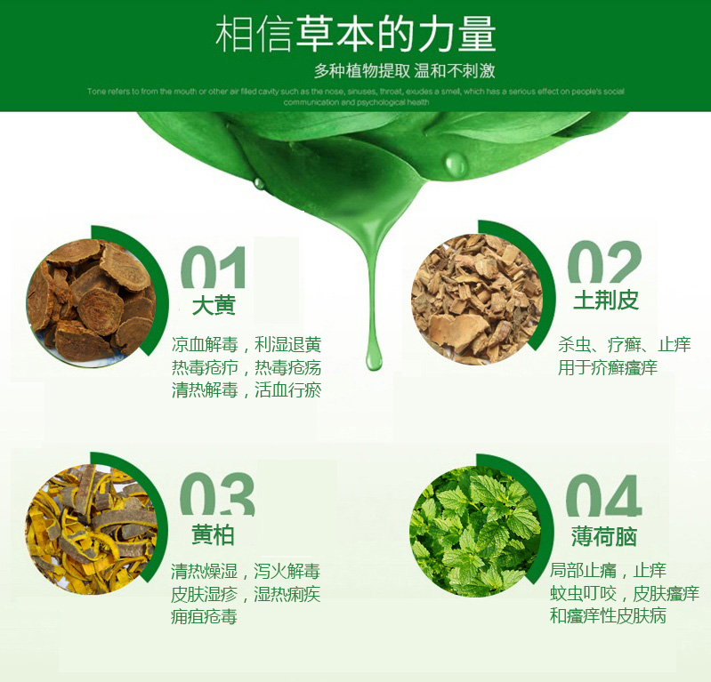 本品为草本配方,有效抑制致病性真菌(白色珠菌)、大肠杆菌、化脓性球菌(金黄色葡萄球菌),清洁皮肤,修复皮损.对于蚊叮虫咬,红肿,细菌、真菌感染,皮肤瘙痒,皮癣湿疹等症状起到抑菌止痒的作用.