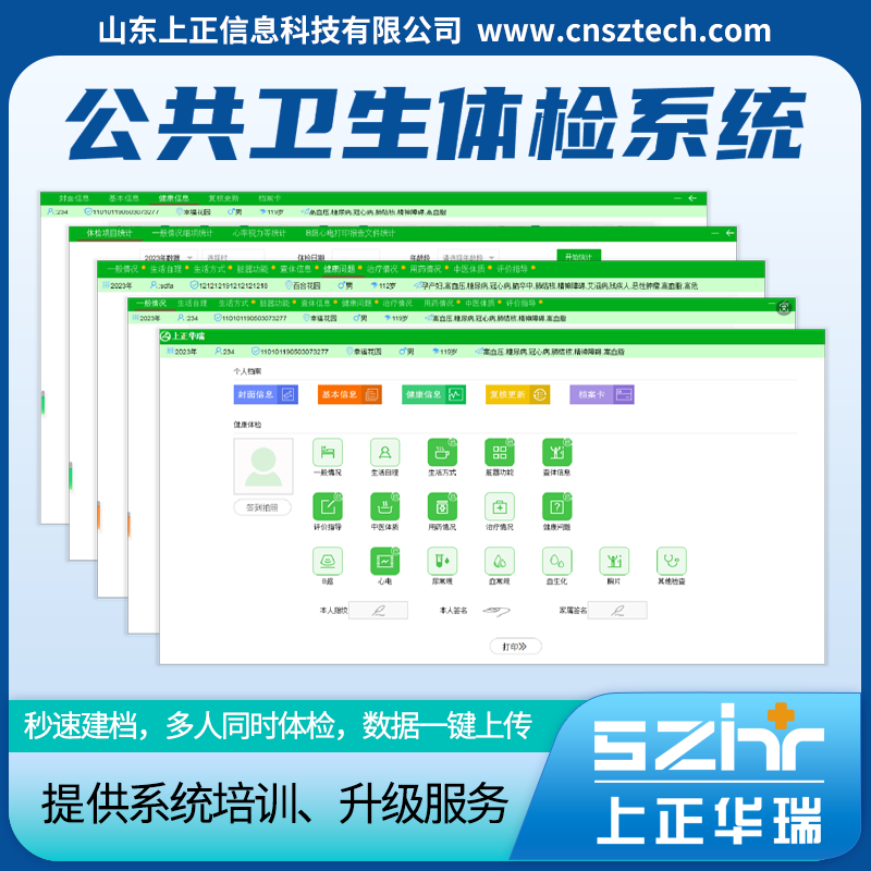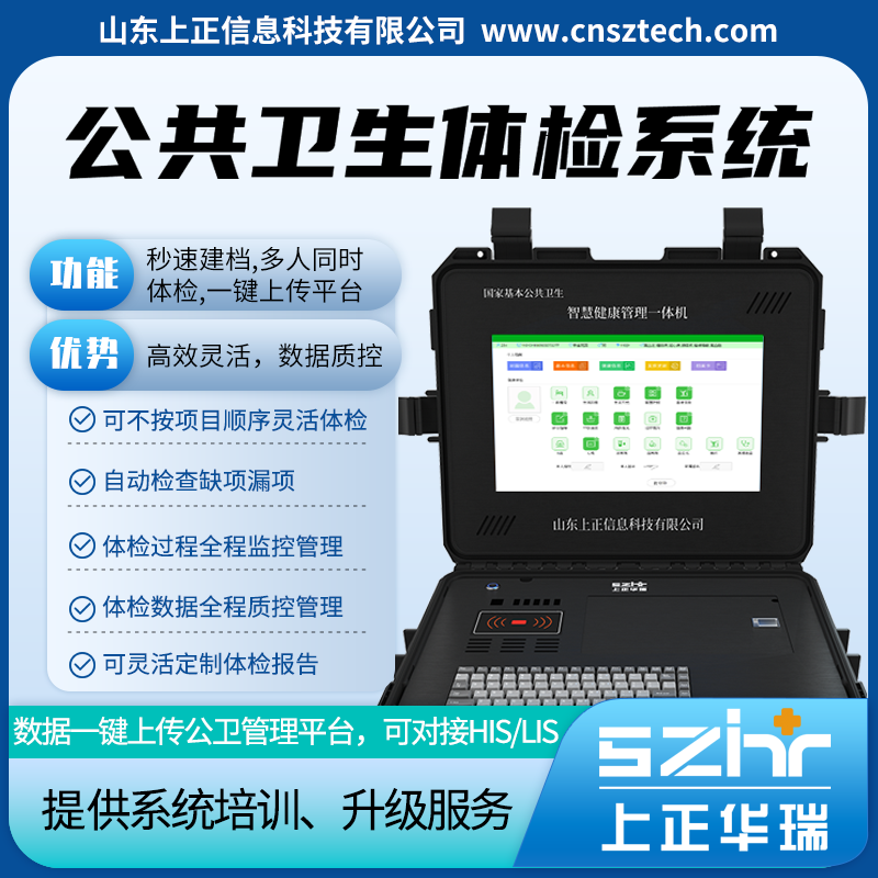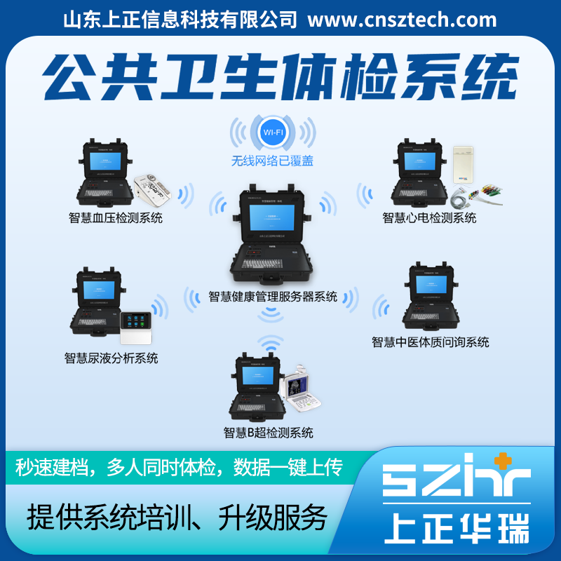 上正华瑞智慧公卫体检系统由山东上正信息科技有限公司自主研发,有一台服务器主机和五台检测分机组成,刷身份证秒速建档,同时打印纸质体检单.系统可进行身高体重、血压、尿液、心电、B超、中医体质辨识等多项目检测,全程无纸化操作,数据采集后自动传入系统,合并到服务器主机.上正华瑞智慧公卫体检系统具备智能漏缺项检查机制,待所有检查项目完成后,一键上传上正华瑞智慧健康云平台,进行数据备份、质控预警、绩效考核和挖掘分析工作.